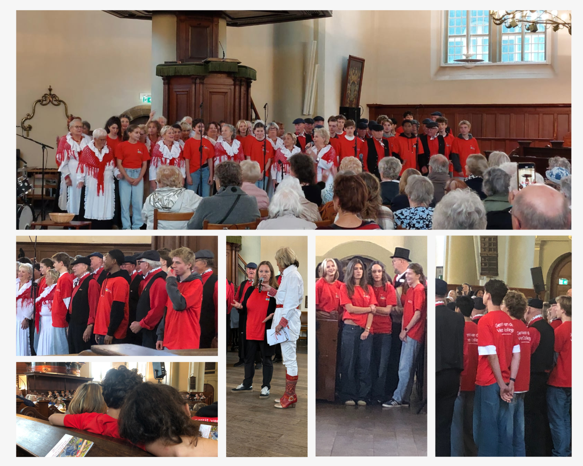 Afgelopen maandag zongen onze muziekleerlingen uit 4V mee met het Zwanenkoor tijdens een concert in de Noorderkerk. Terwijl de kerk langzaam volstroomde met vooral veel oude genieters van het Amsterdamse Levenslied maakten onze leerlingen zich achter de schermen op voor de uitvoering. Enigszins nerveus maar met name onder de indruk van het koor en de volle kerk verschenen zij na de pauze op het toneel. Gekleed in een rood Gerrit-shirt zongen zij vervolgens samen met het koor een breed repertoire van Jordanese zangers, van Johnny Jordaan en Tante Leen tot Willy Alberti en André Hazes.
